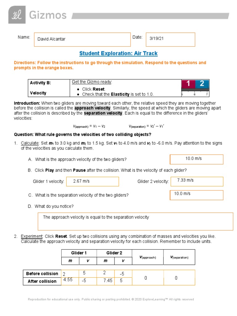 Click Reset. Check That The Elasticity Is Set To 1.0. Turn Off Show Numerical Data For Both Gliders / Vue Products Pasco Scientific / Turn on show numerical data and use the gizmo to check your answer.